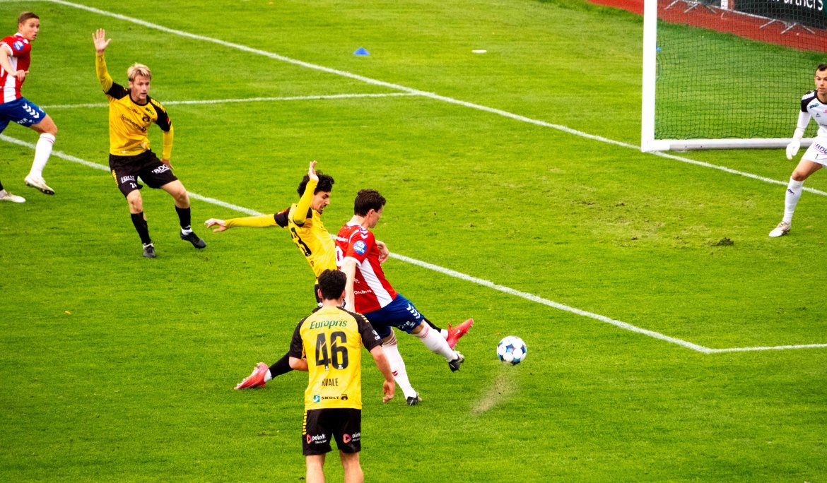 Vår toppscorer er ikke ferdig, og bare minutter etter sin første havner han i en helt identisk situasjon. Bjørntvedt Olsen skyter fra utsiden av sekstenmeteren, og Hellum venter på returen. Denne gangen får ballen en ekkel sprett, og avslutningen går i tverrliggeren, og ut.